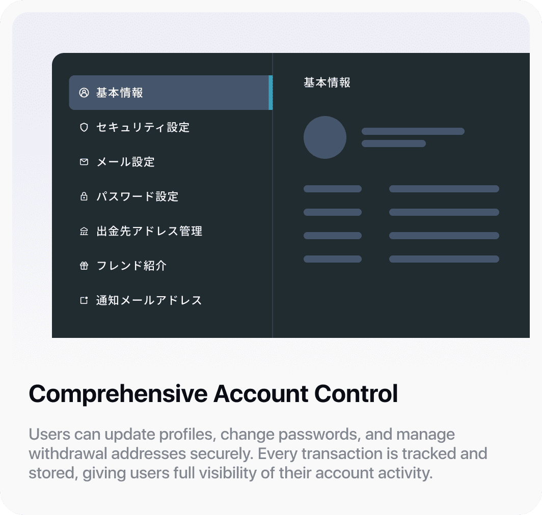 Comprehensive account management and transaction tracking ensure that every activity is transparent and under the user’s control.